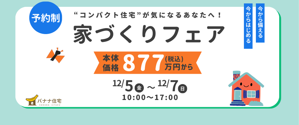 こんにちは!バナナ住宅です🍌今回は 「コンパクト住宅をお考えの方」 にぴったりのご案内です🏠✨⠀マイホームがほしいけれど…・価格が気になる・大きすぎない家がちょうどいい・無理のない資金計画で建てたいそんな声を多くいただき、ついに開催します!⠀🏠 家づくりフェア 開催!“コンパクト住宅ってどうなの?”そんな疑問に応えながら、等身大の暮らしをイメージできるフェアとなっています😊⠀今回の目玉はなんと…本...